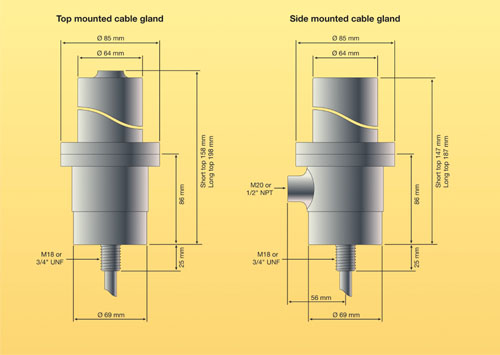 M18 or 3/4"UNF Mounting flange thread - M20 or ½"NPT opening thread - long or short top - top-mounted, side-mounted, or dual side-mounted openings. See Combination Chart in the downloadable pdf-datasheet.
