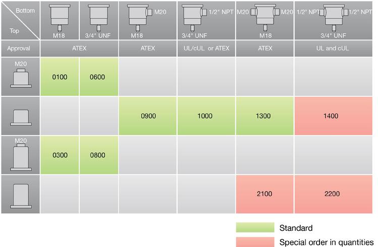 M18 or 3/4"UNF Mounting flange thread - M20 or ½"NPT opening thread - long or short top - top-mounted, side-mounted, or dual side-mounted openings. See Combination Chart in the downloadable pdf-datasheet.